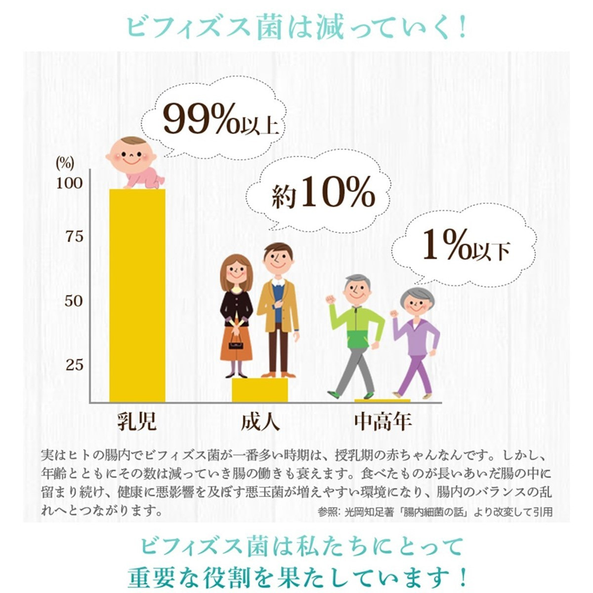 ビフィズス菌は年齢とともに減少するため、毎日の食事に加え、サプリメントを補うことが大切です。