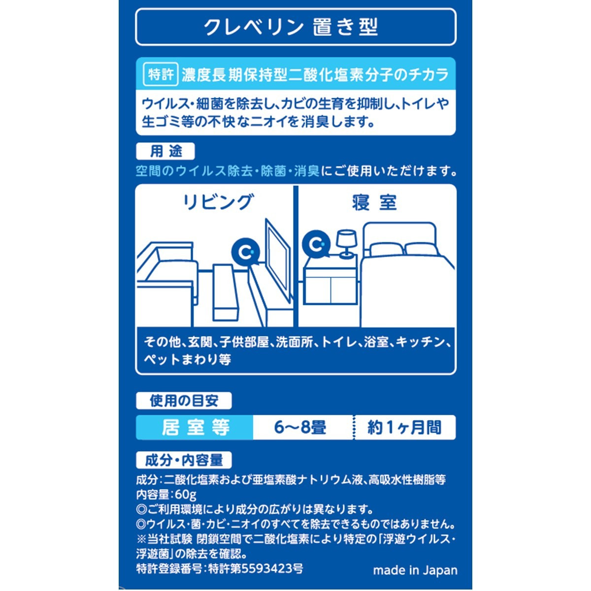 6畳相当(25㎥)の閉鎖空間でクレベリン置き型製品により、浮遊・付着ウイルスの一種、浮遊・付着菌の一種を180分間で99.9%除去できることを確認。