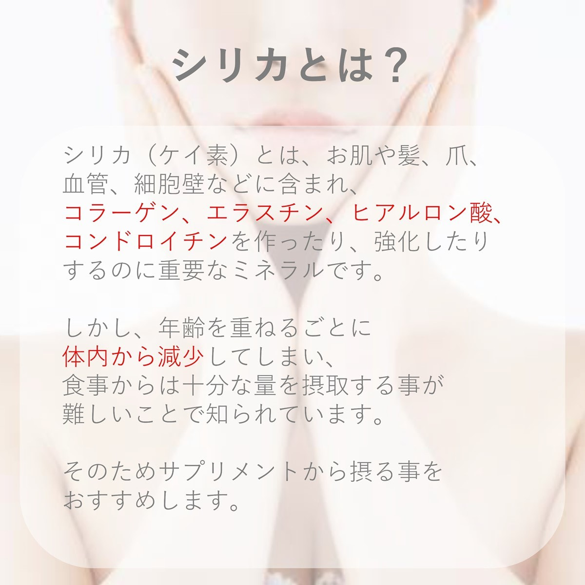 シリカ(ケイ素)は肌、髪、爪、血管、骨、関節など体のあらゆる組織に多く含まれるミネラルで、ハリ・うるおいなどの美容や、余分なものをスッキリさせるのに重要な働きがあります。