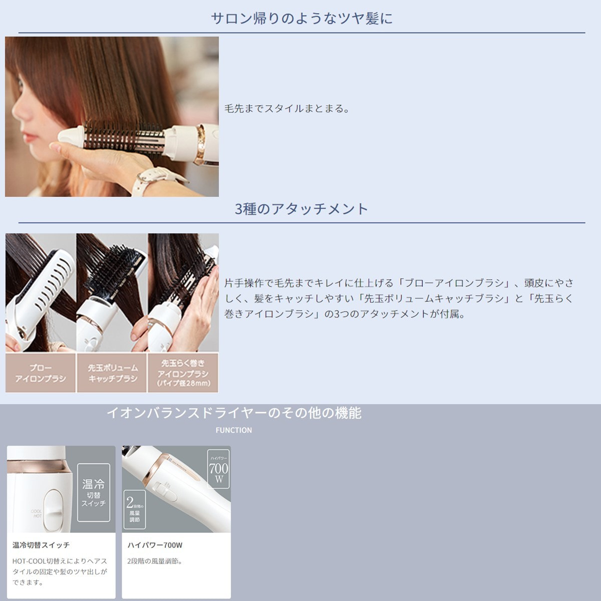 3種のアタッチメント付きで、幅広いヘアスタイルに対応します。