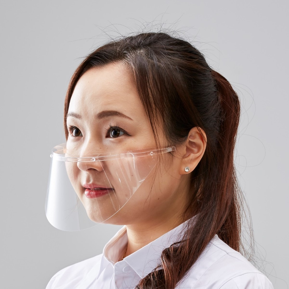 鼻から口元の飛沫拡散を防止する透明クリアシールドです。