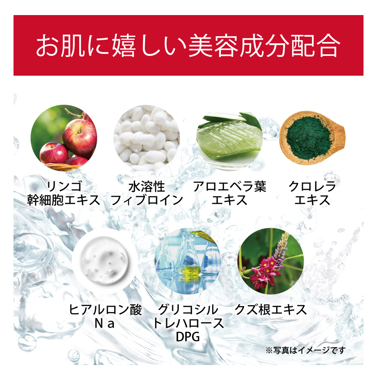 水、グリセリン、ポリアクリル酸Na、DPG、グリコシルトレハロース、加水分解水添デンプン、アクリル酸Naグラフトデンプン、リンゴ果実培養細胞エキス、クズ根エキス、アロエベラ葉エキス、クロレラエキス、ヒアルロン酸Na、水溶性フィブロイン、酒石酸、PPG-8セテス-20、酸化チタン、グリシンAl、BG、キサンタンガム、レシチン、水酸化Al、含水シリカ、フェノキシエタノール、メチルパラベン