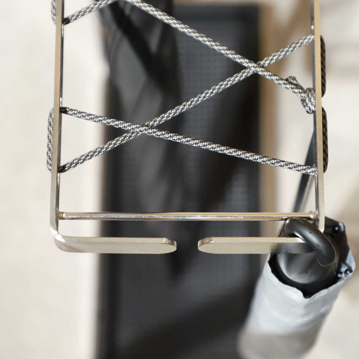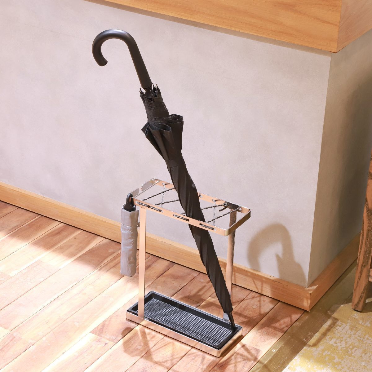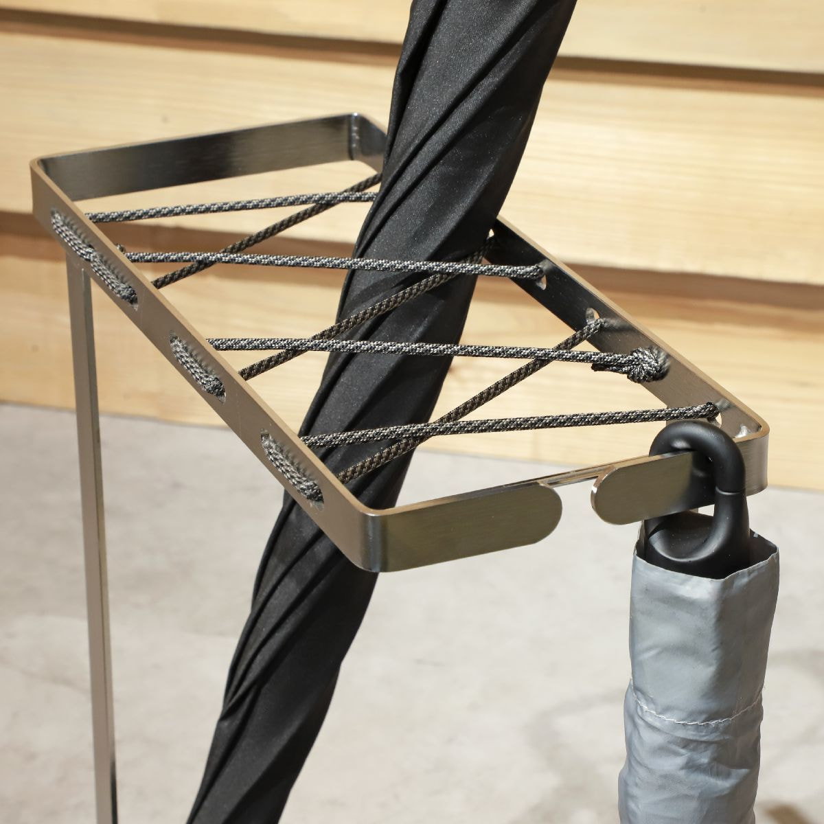折りたたみ傘も持ち手のリングを引っ掛けられるので、倒さずに収納ができます。