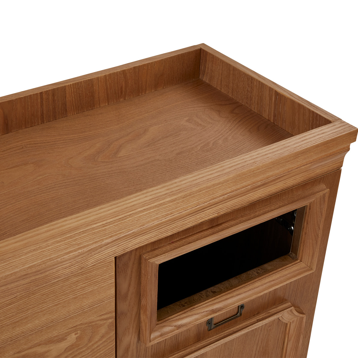 味わい深いアンティーク感を醸し出す、扉のアイアンパーツとモールディング加工が施された天然木サイドシャンプーキャビネット。