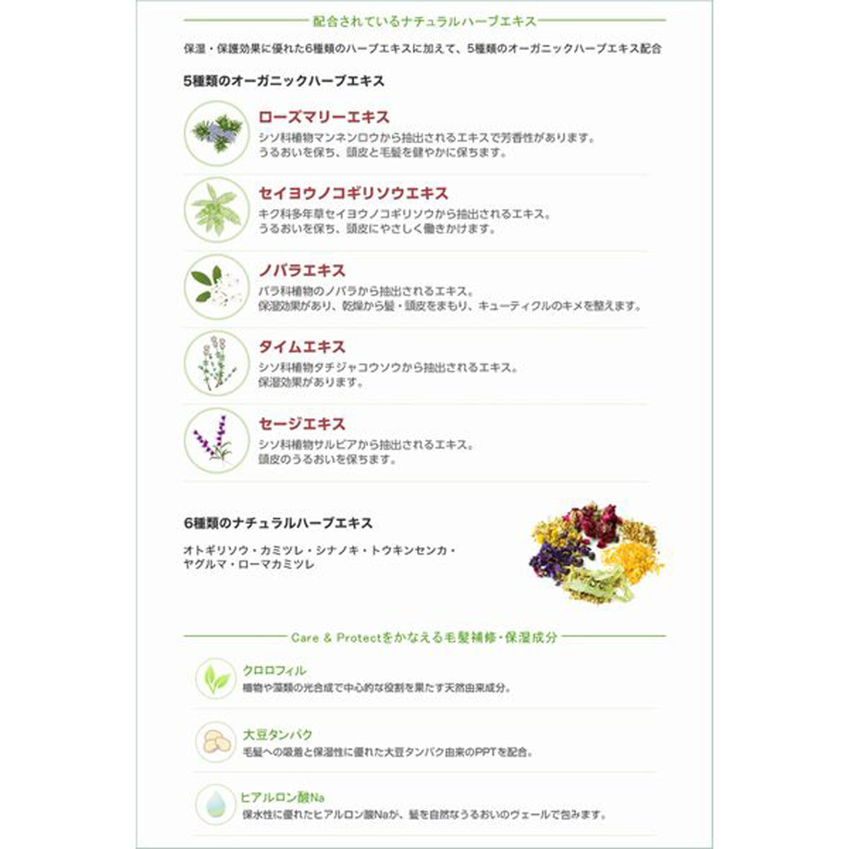 保湿・保護効果に優れた6種のハーブエキス、補修・保湿成分に加えて、5種類のオーガニックハーブエキスを配合。