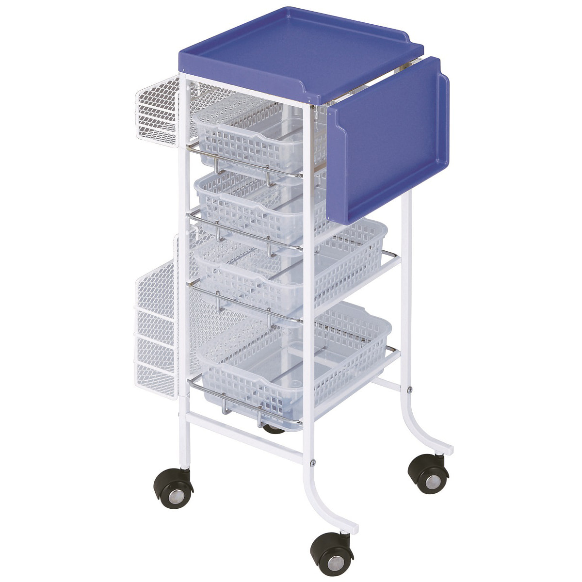 たっぷり収納可能な5段式で、サイドにも大小のラックが付いており、ヘアカラーやブラシ、ボトルやミラー、カルテ類の収納もできます。