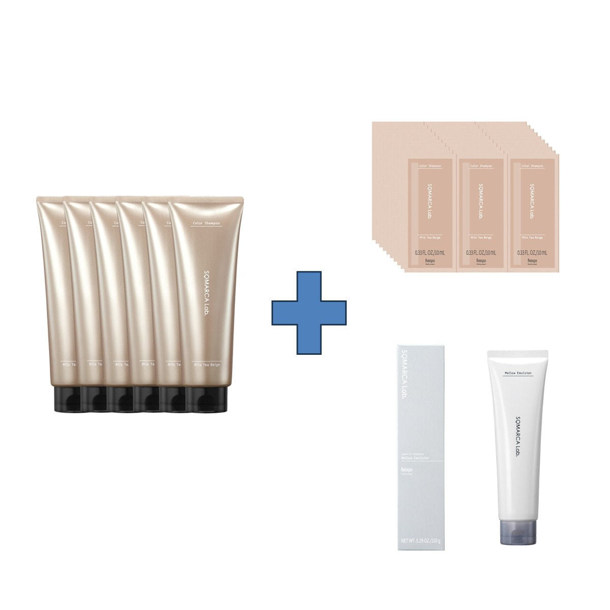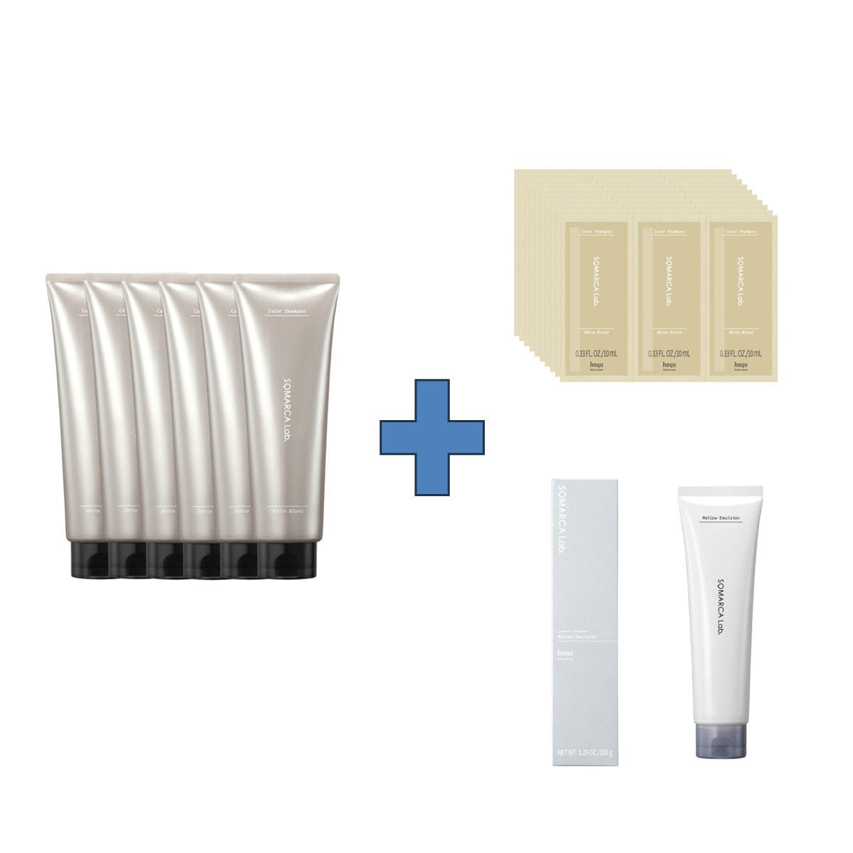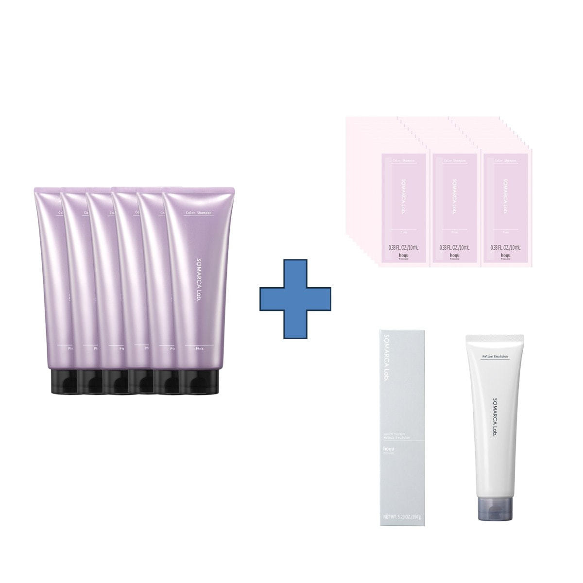 各色180mlを6本ご購入で同色のサシェ(10ml×3)10枚とハイトーンの髪悩みに特化した洗い流さないトリートメント、ソマルカラボ「メロウエマルジョン」150g1本が添付される特別セットです。