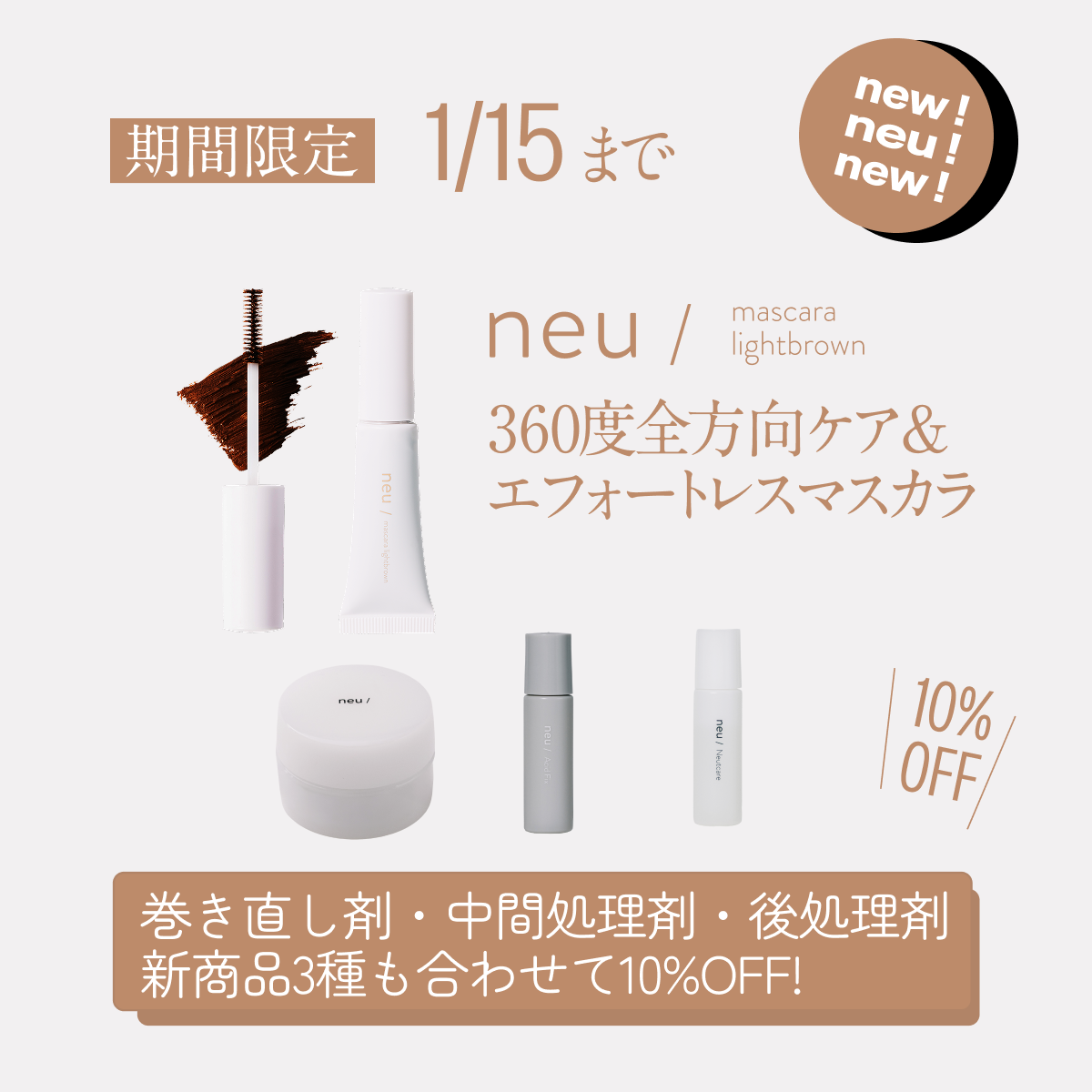 【neu/】マスカラ、巻き上げ専用剤、中間&後処理剤の新商品4種が10%OFFキャンペーン!~1/5(月)まで!