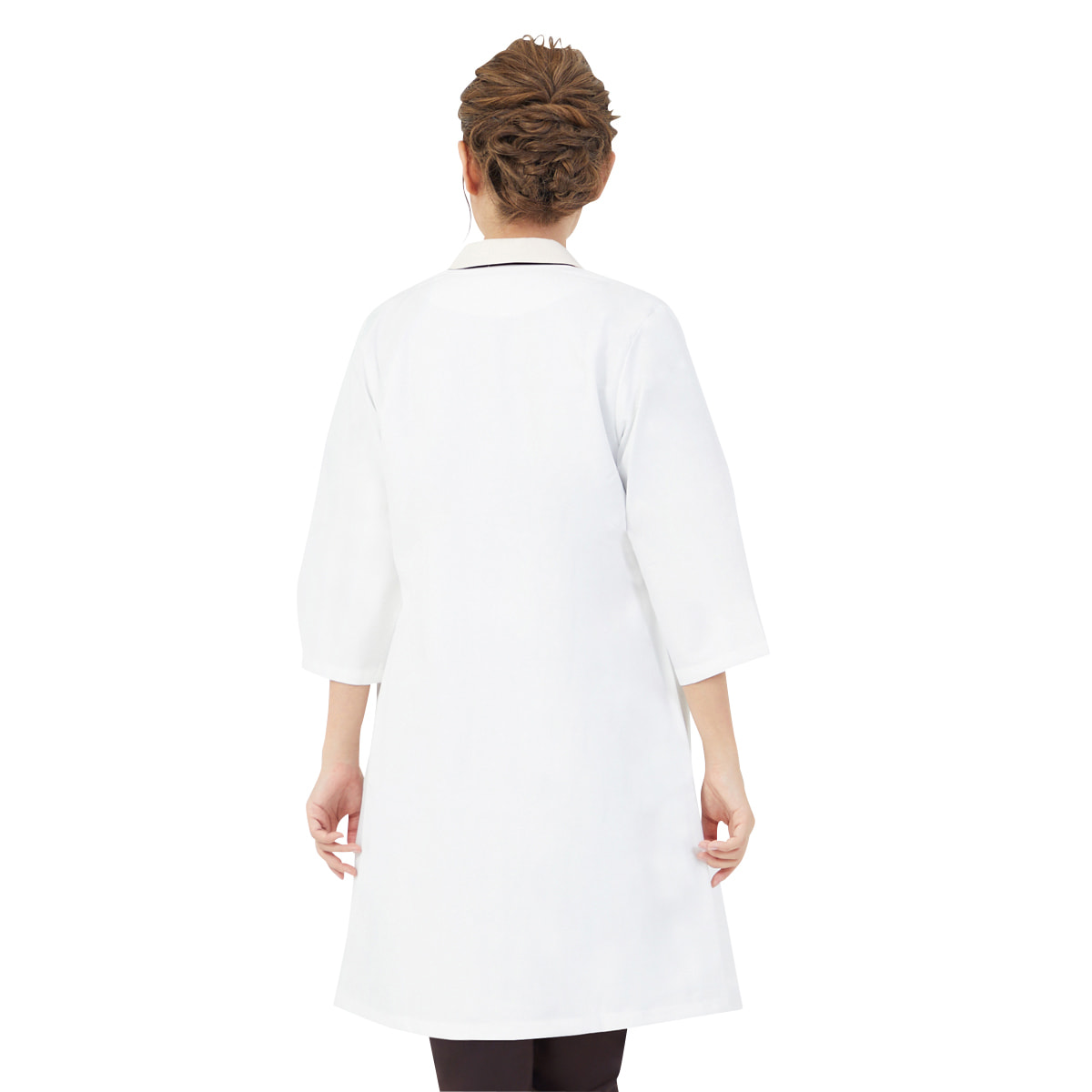 グレーのパイピングをポイントに、スッキリしたフロントスタイルが清潔感のある白衣。