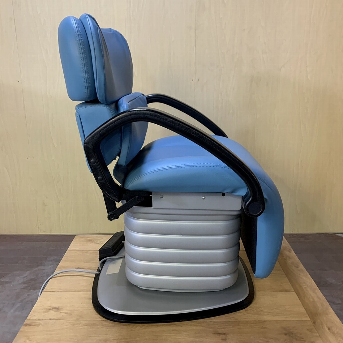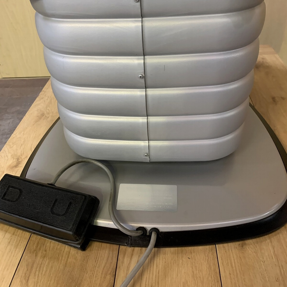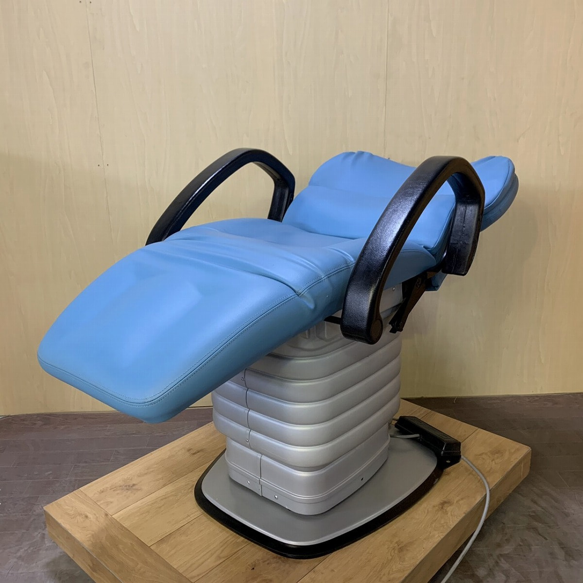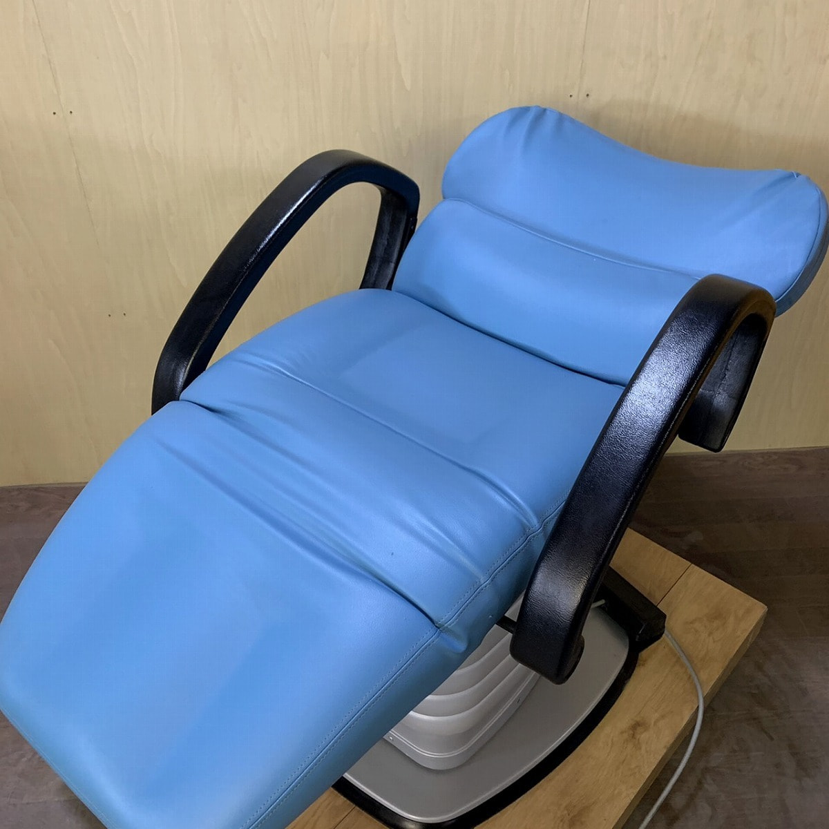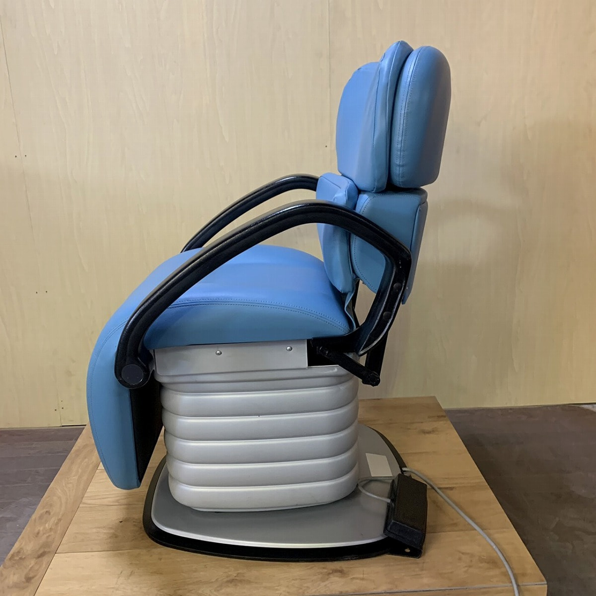 オオヒロ電動シャンプー椅子の『B-111NS』です。フットスイッチで動作させるタイプのシャンプー椅子で、一度U(アップ)を踏んでいただくと設定位置まで倒れます。