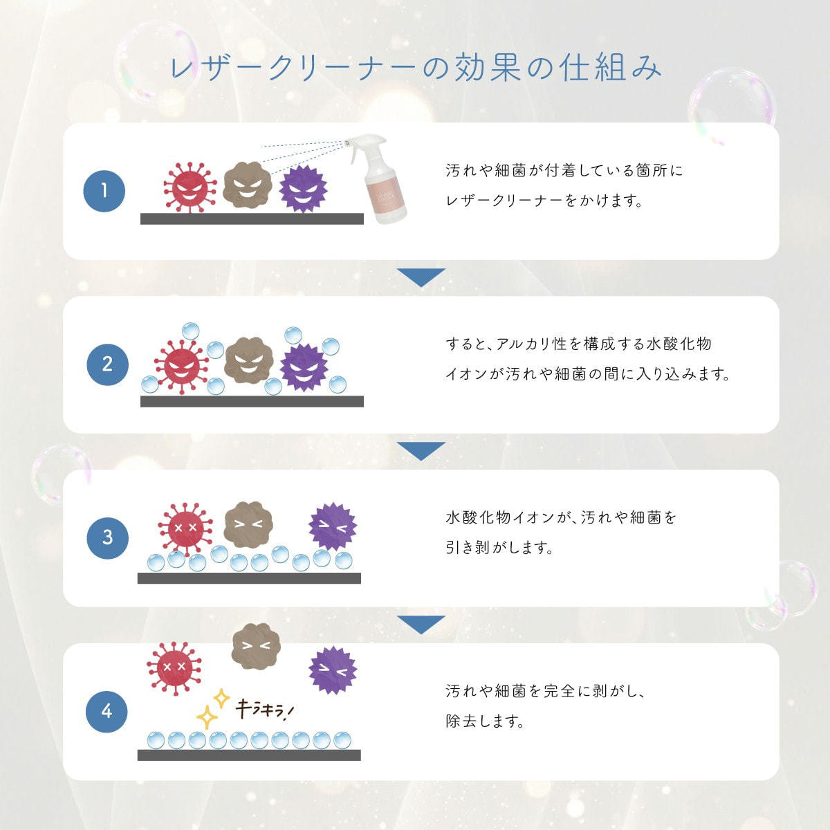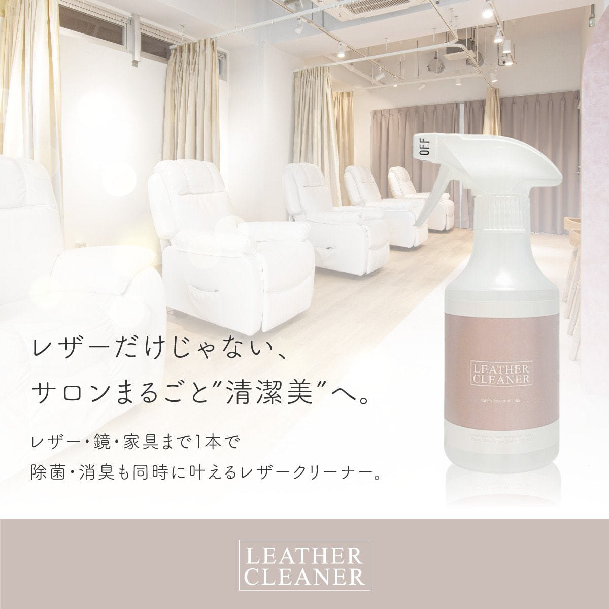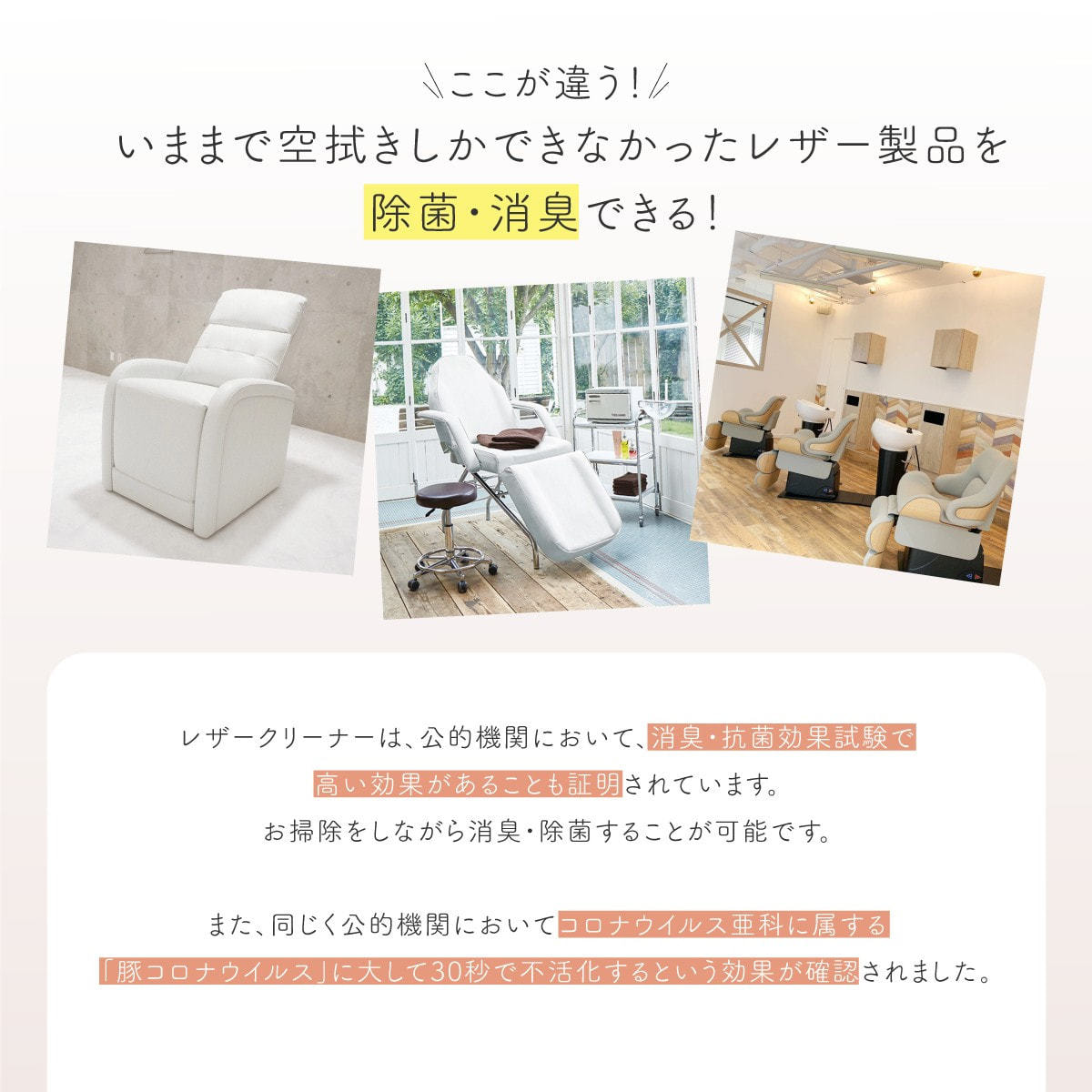 レザー・PUレザー製のベッドやチェアなど、サロンで多く使われる素材に対応し、 レザーの色落ち試験をクリアしているため、安心して日常清掃・除菌・消臭にご使用いただけます。
