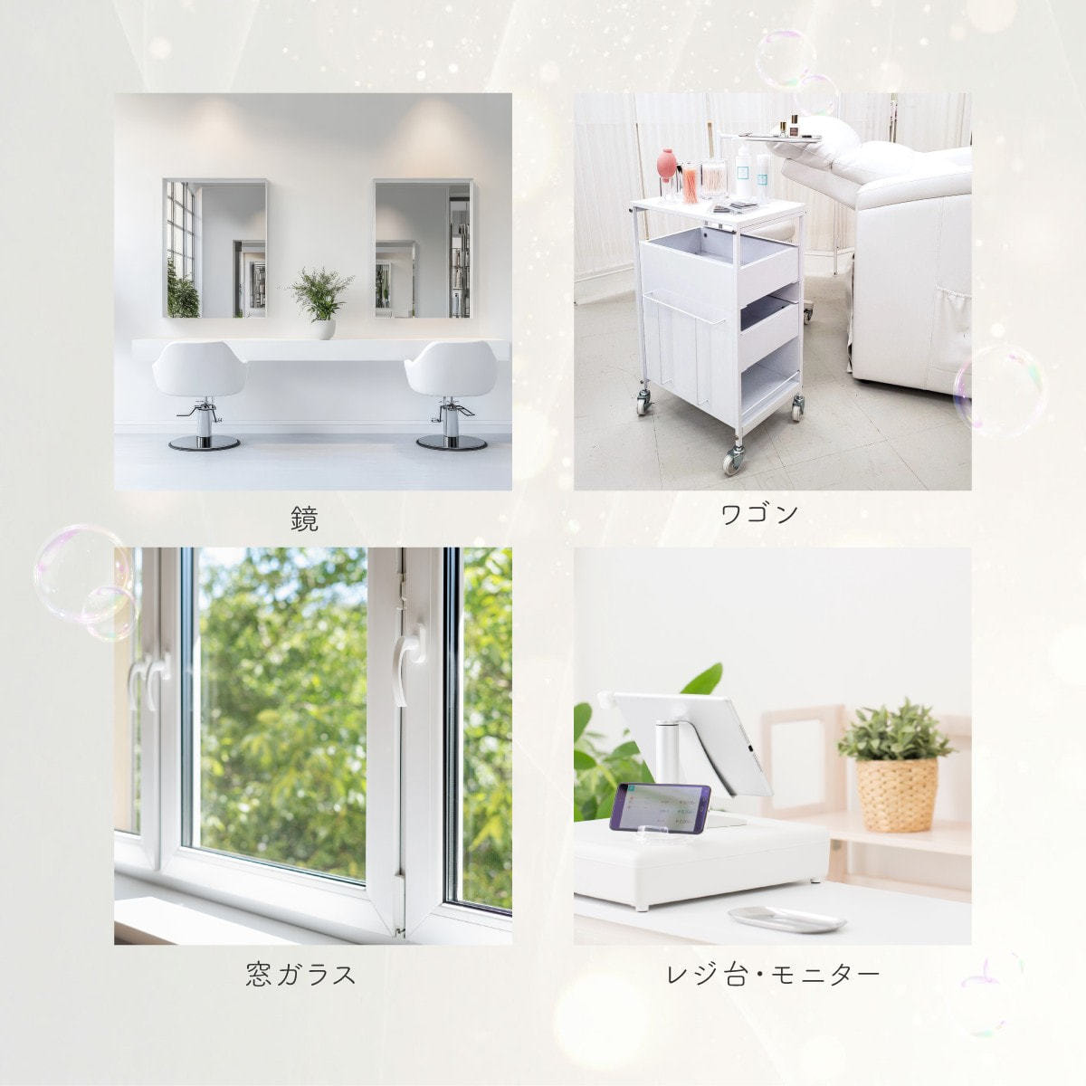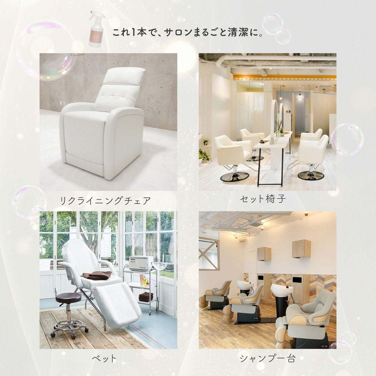 施術ベッド、シャンプーチェア、スツールなどのレザー製品はもちろん、 鏡・ガラス・カウンター・ドアノブ・器具類・スマートフォン・PCモニターまで、 サロン内の様々な素材を1本で清掃・除菌・消臭できます。
