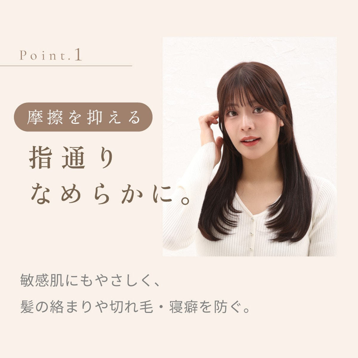 髪の絡まりや切れ毛・寝癖を防ぎ、朝のスタイリングをスムーズにします。敏感肌にもやさしい素材です。