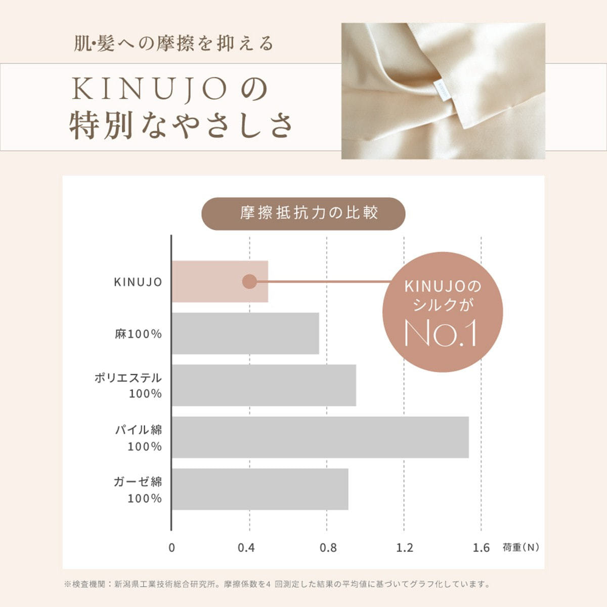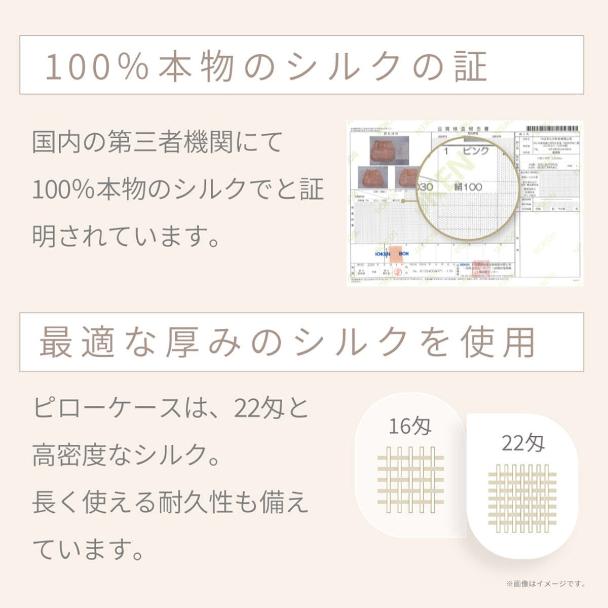 KINUJO Silk Richに使用しているシルクは、国内の第三者機関にて100%本物のシルクであることが証明されています。