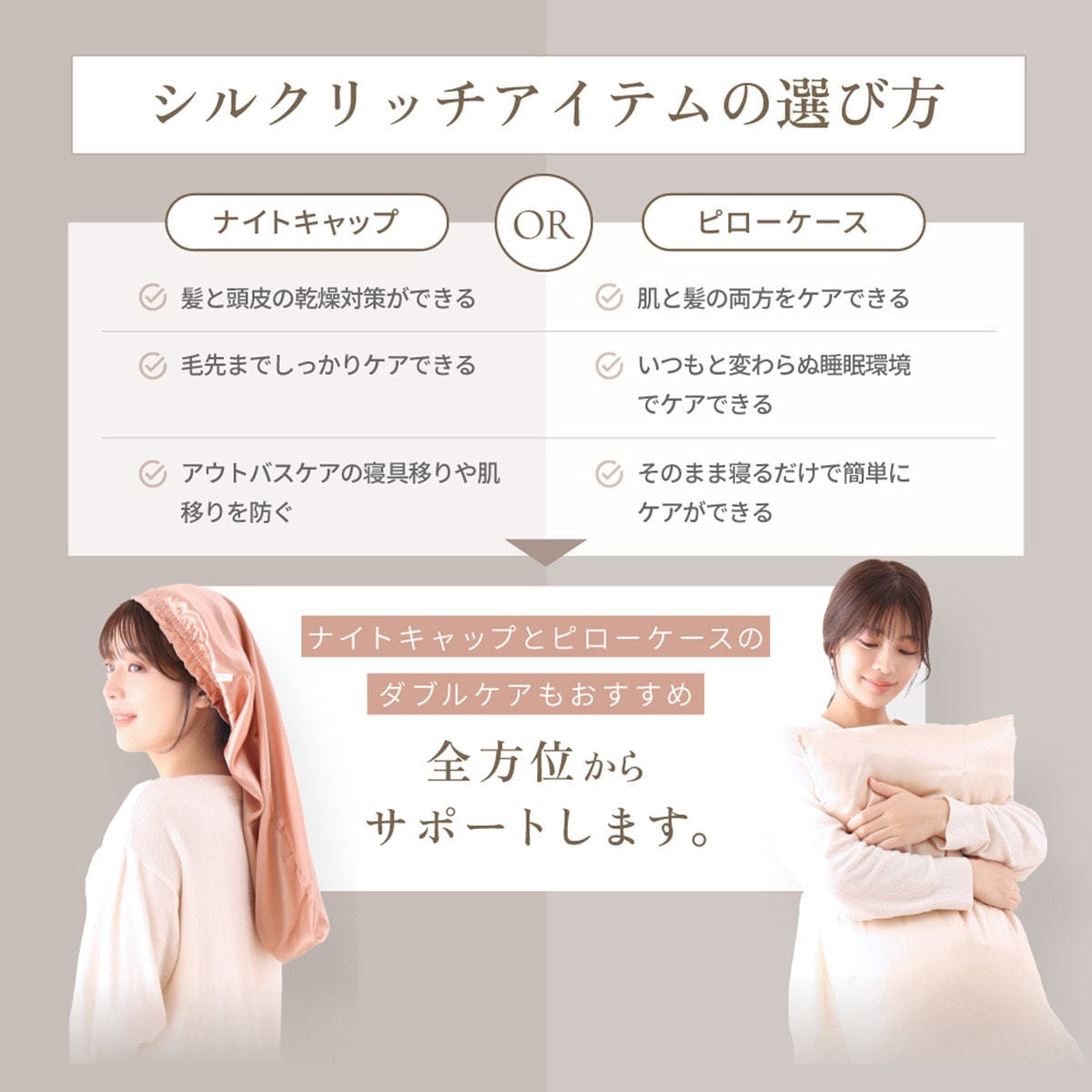 ナイトキャップとピローケースのダブルケアもおすすめ。