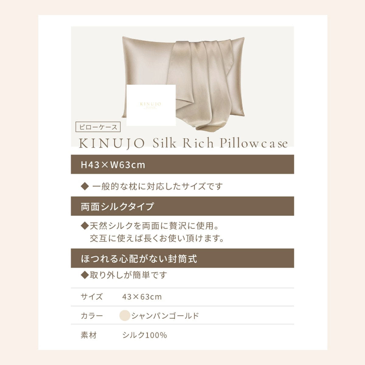 【New】 KINUJO Silk Rich Pillowcase(シルクリッチピローケース) シャンパンゴールド