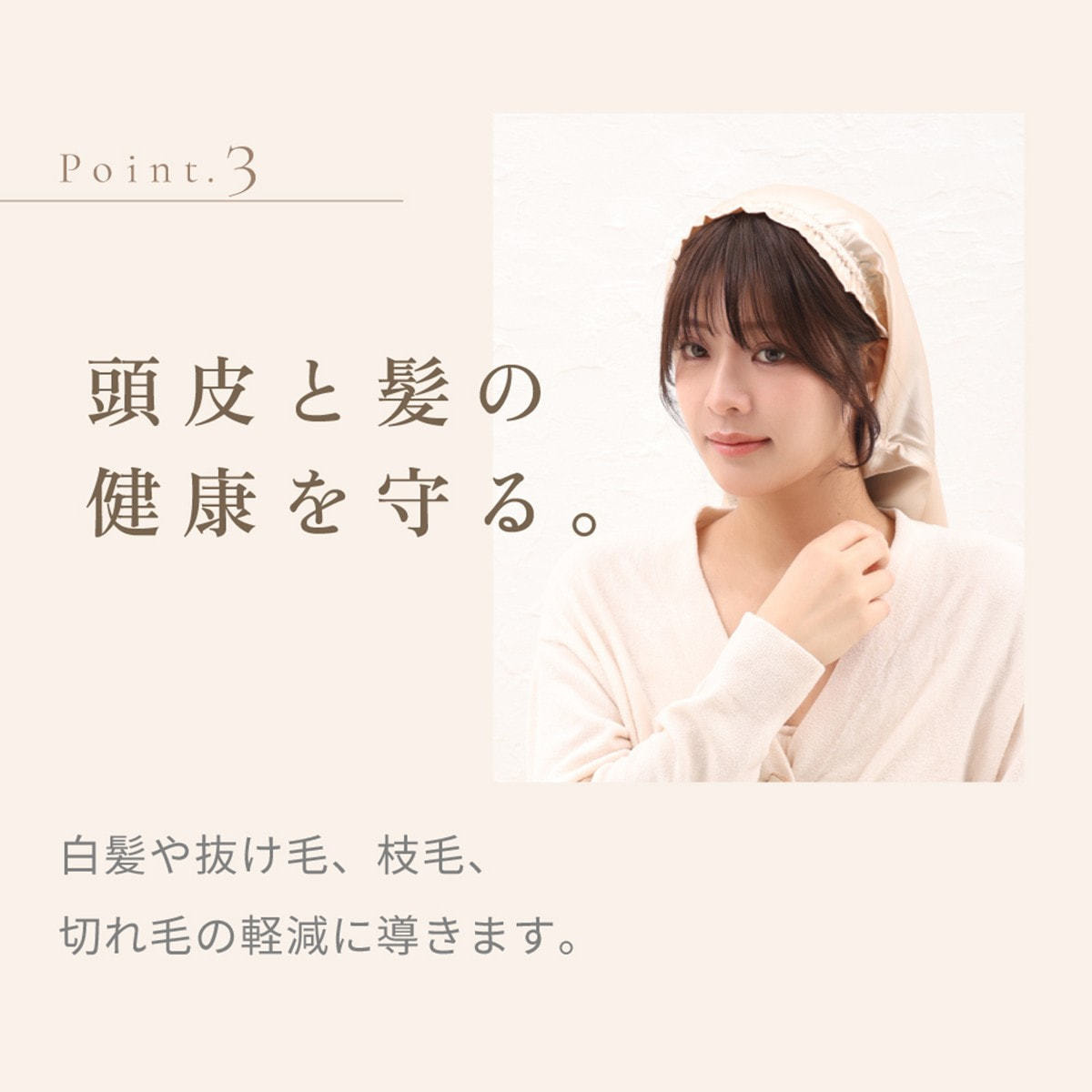 睡眠中の乾燥を防ぎ、頭皮のたるみや毛穴のゆがみを抑えることで、白髪や抜け毛、枝毛、切れ毛の軽減にも繋がります。