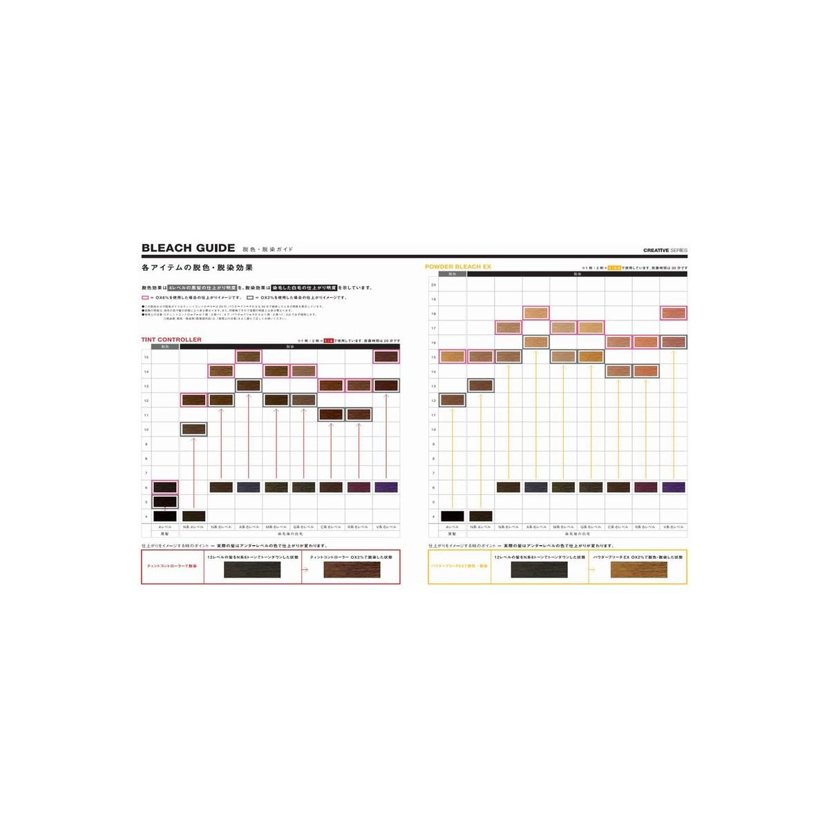 パウダーブリーチEXは、放置時間に合わせて脱色作用と脱染作用が同じスピードで進んでいきます。従来よりも急激な明度の変化や上がりすぎが少ない設計なので、放置時間での明度調節がしやすく安定的な仕上がりが得られやすくなります。