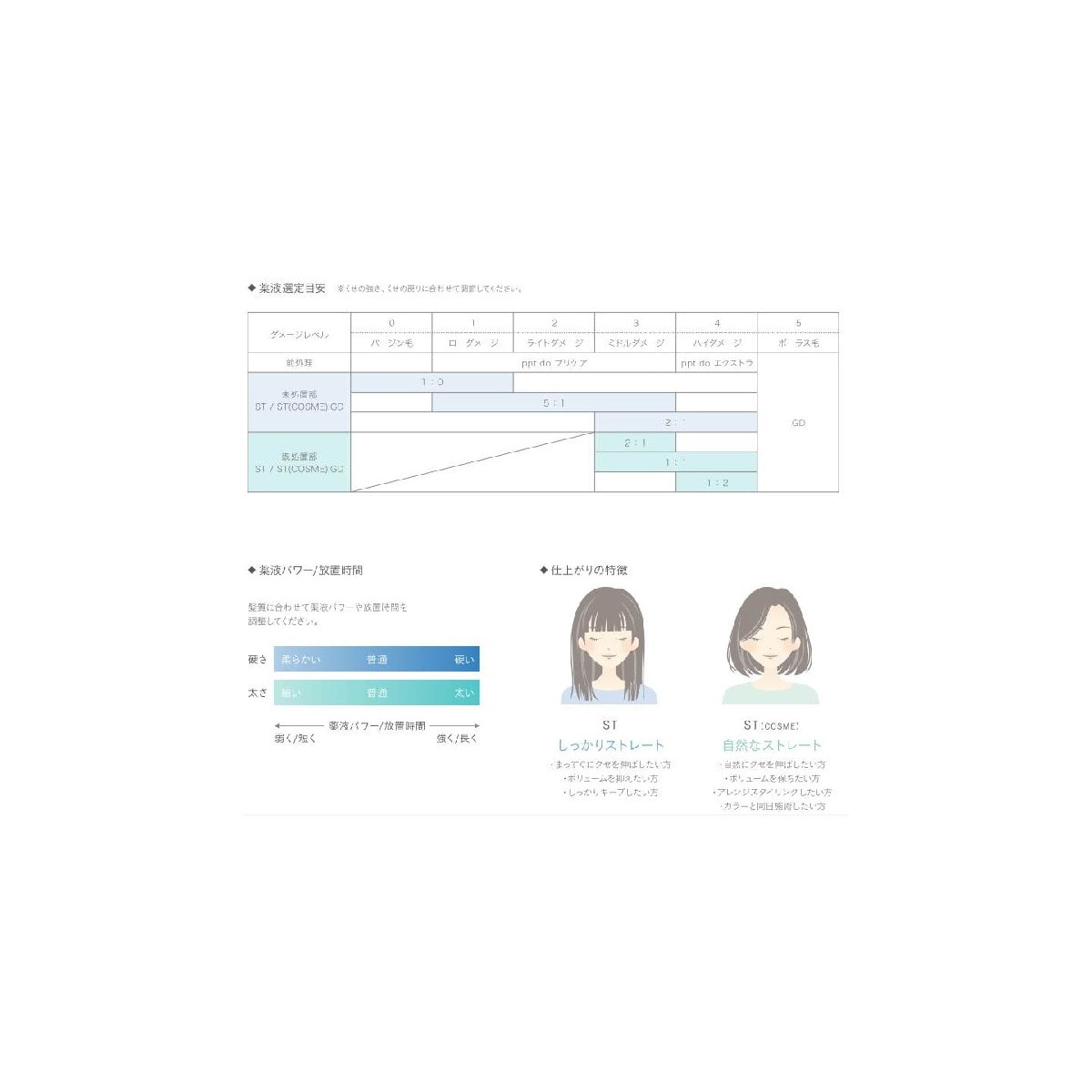 2種の薬液と減力保護液の組み合わせで、ストレート感の強調から柔らかな風合いまでをコントロール。