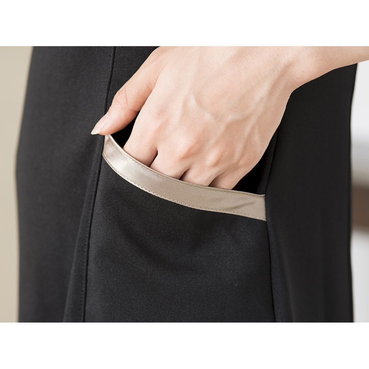 サテン地の高級感あるデザインで、さらっと着心地の良い素材で快適。3つのポケットがついた便利で使いやすさがいつも着たくなる美人ワンピース。